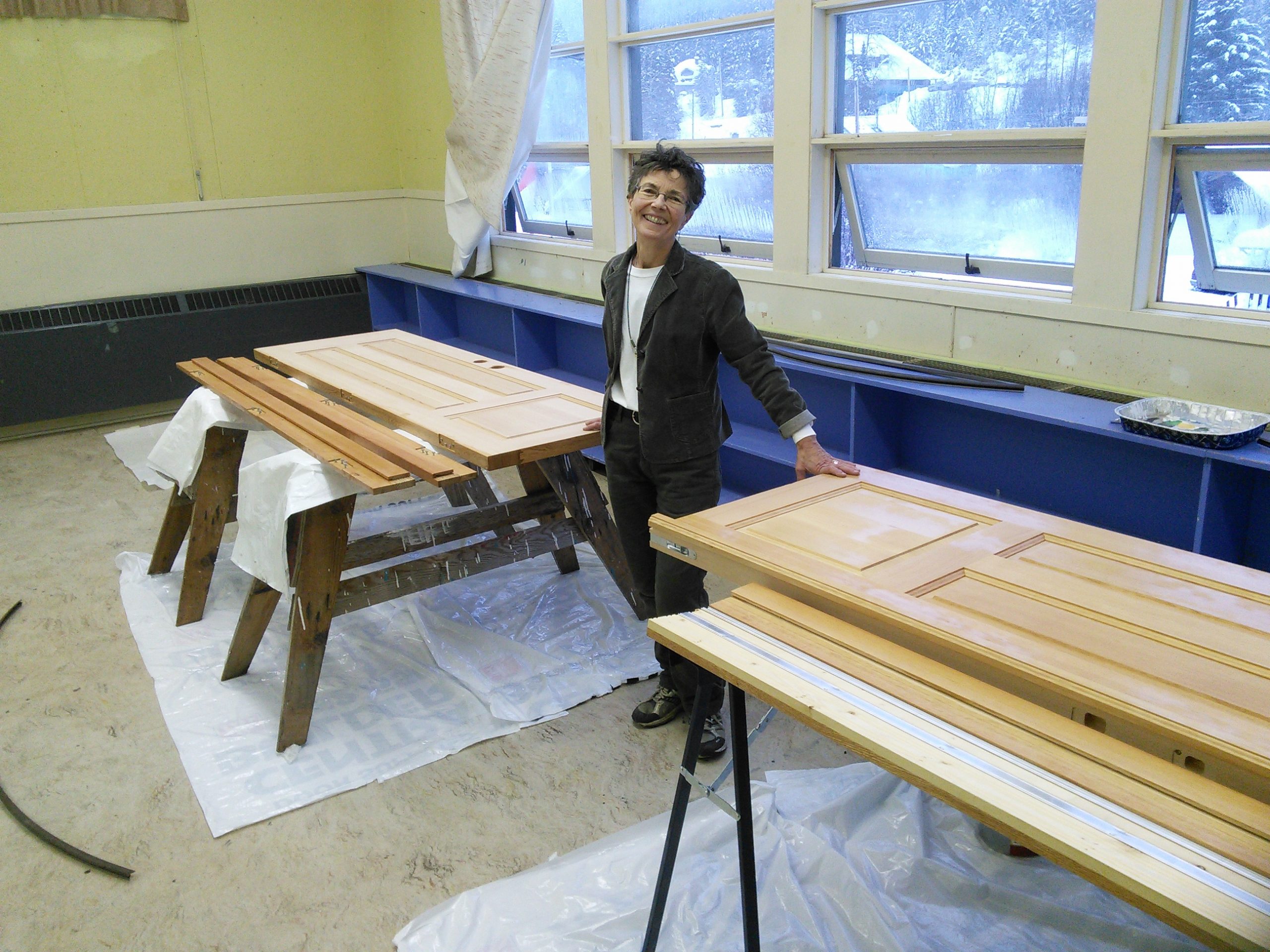 Claire with new fir doors being coated & sanded.